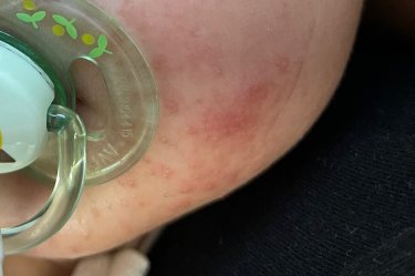у нас так было от ремня на автокресле (замшевые такие), просто ребенок голову наклонял таким образом , что лицо с соприкасалось с этой заменой накладкой. Я тоже была уверена , что аллергия, но нет